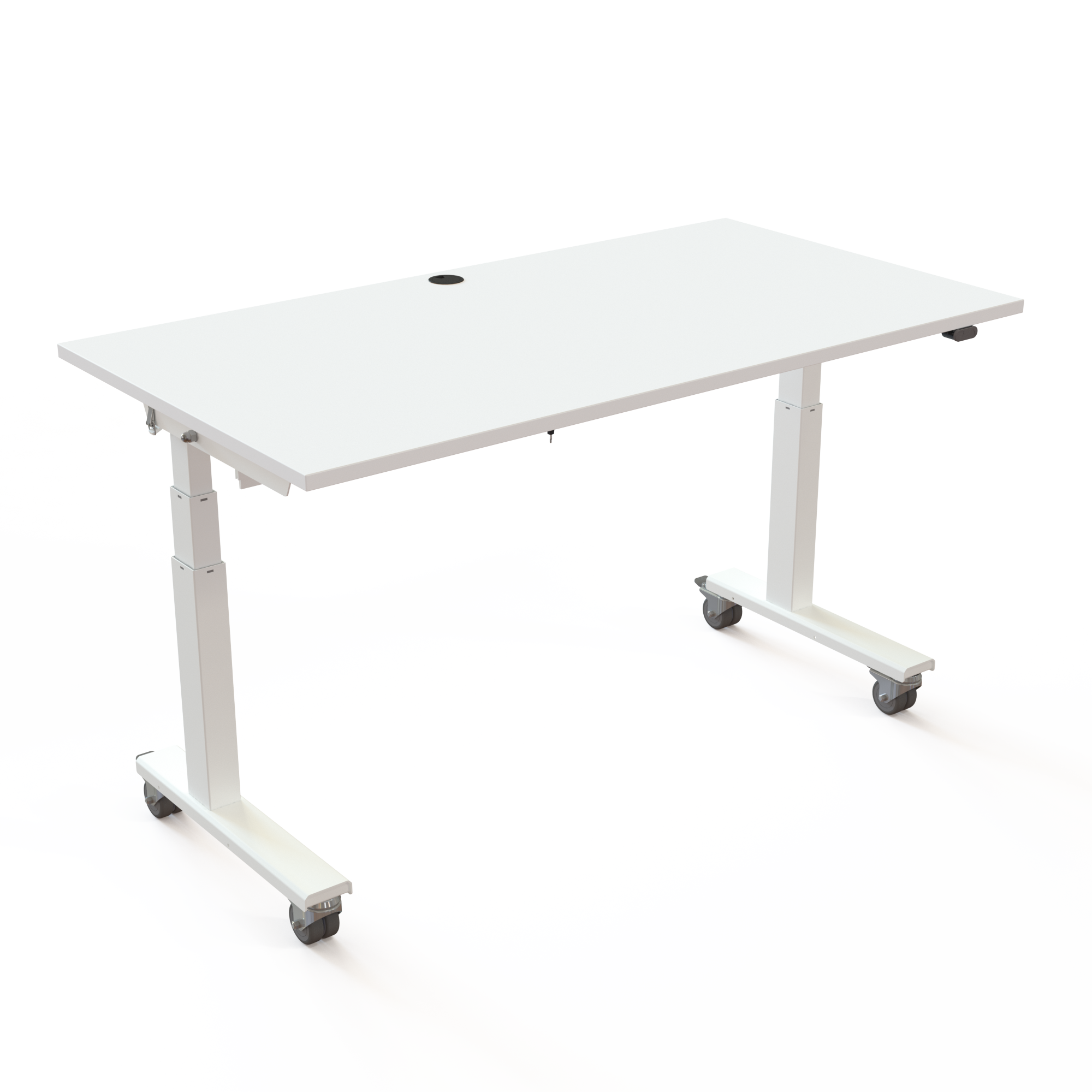 With adjustment from 670-1320 mm and a capacity of 40 kg, it is comfortable for both seated and standing work despite the wheels. The frame is finished in powder-coated steel RAL 9016 (white), perfectly matched with a robust white melamine tabletop. It takes a mere to assemble—a major plus when deploying many units in a nesting configuration. The 501-96 is the premier solution for modern hot-desking where functional design is a priority.